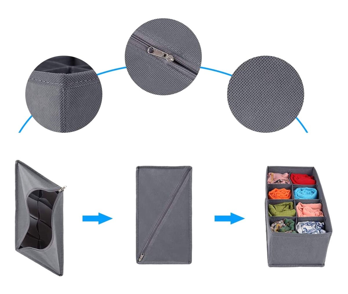Organizatoriai pagaminti iš orui laidžios ir lengvai valomos medžiagos, todėl jie tinka apatiniams drabužiams ar kitiems tekstilės gaminiams laikyti. Sutvirtinti šonai padeda išlaikyti formą, o sulankstomas dizainas leidžia sutaupyti vietos, kai dėklai nenaudojami.