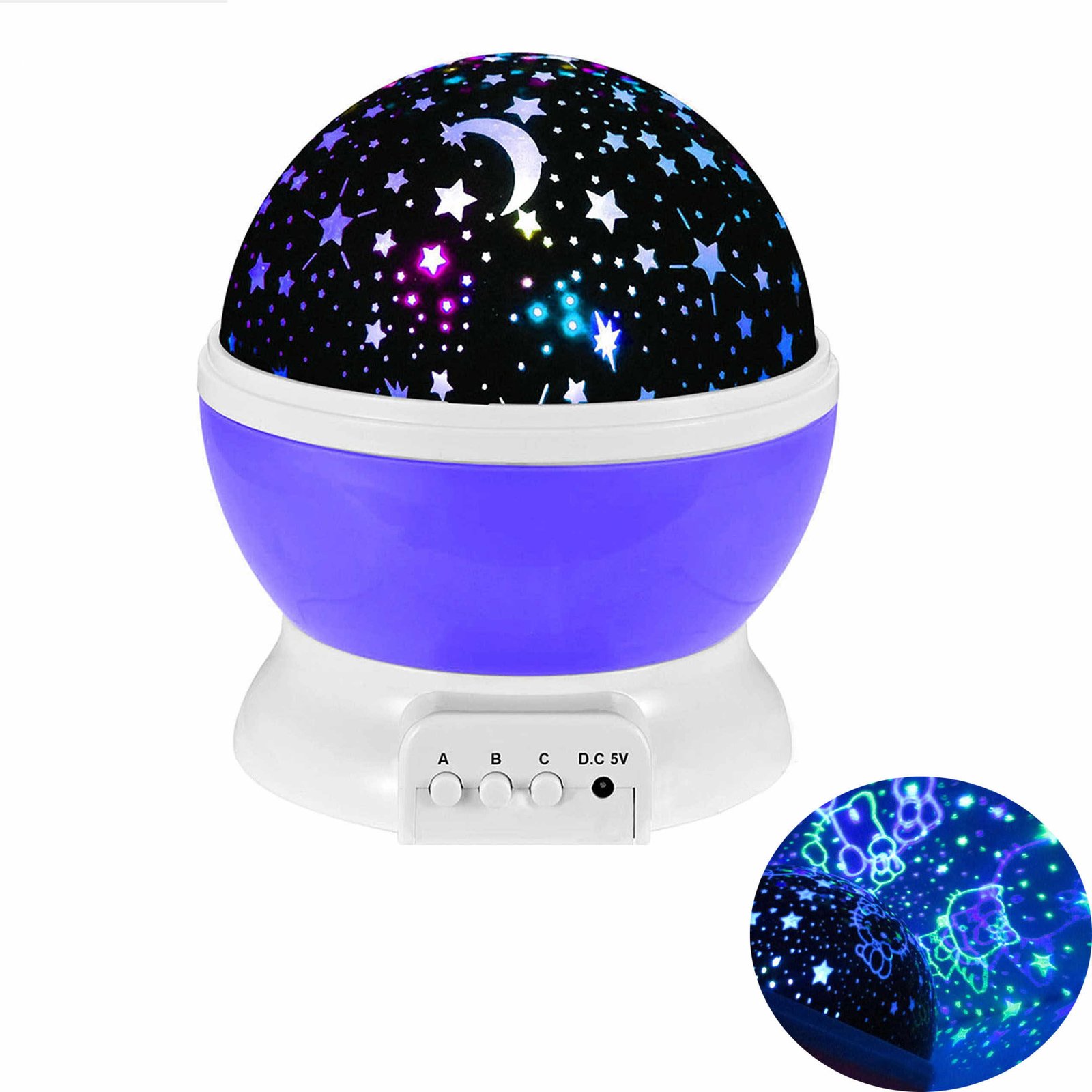 Galimi įvairūs spalvų deriniai: šilta balta, mėlyna, žalia ir raudona. Projektorius gali būti maitinamas USB laidu (DC 5V) arba AA baterijomis, todėl jį patogu naudoti tiek namuose, tiek kelionėse.