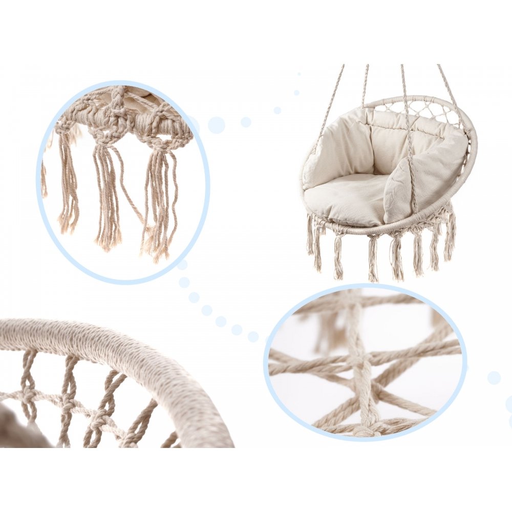 Ši pakabinama hamako kėdė puikiai tinka įvairioms erdvėms – sodui, balkonui, terasai ar net vidaus interjerui. Dekoratyvūs virvių kutai ir modernus dizainas suteikia jaukumo bei stiliaus bet kuriai poilsio zonai.
