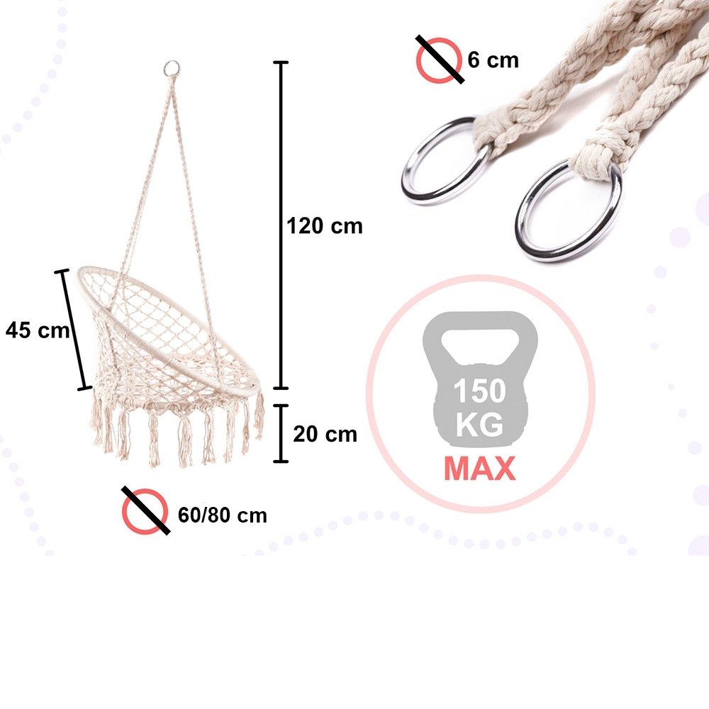 • Tvirta konstrukcija – medvilninės virvės ir metalinis rėmas užtikrina stabilumą.