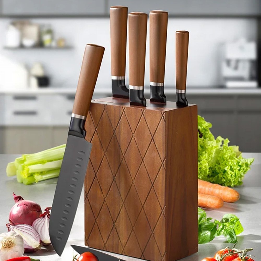 Tvirtas akacijos medžio stovas ne tik padeda patogiai laikyti peilius vienoje vietoje, bet ir tampa stilingu virtuvės akcentu.